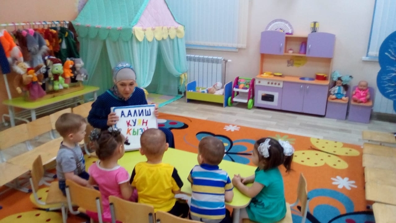 Индивидуальная работа с детьми первой младшей группы.Дети учатся рассказывать сказку А.Алиша "Куян кызы". Помогает им в этом ковробук.Заранее до этого мотрели одноименный мультфильм.