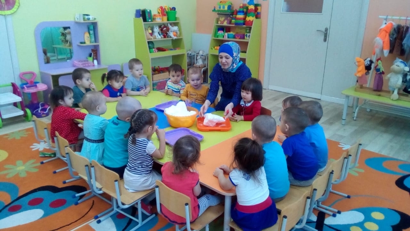 С детьми первой младшей группы МБДОУ "Кубэлэк" провели эксперименты со снегом:миску со снегом поставили на стол.Каждый ребенок его потрогал,ощутил его холод.Сказали,что он белый.Узнали,что снег может быть разного цвета,если его покрасить.Увидели,что снег,положеный утром в стакан,расстаял.