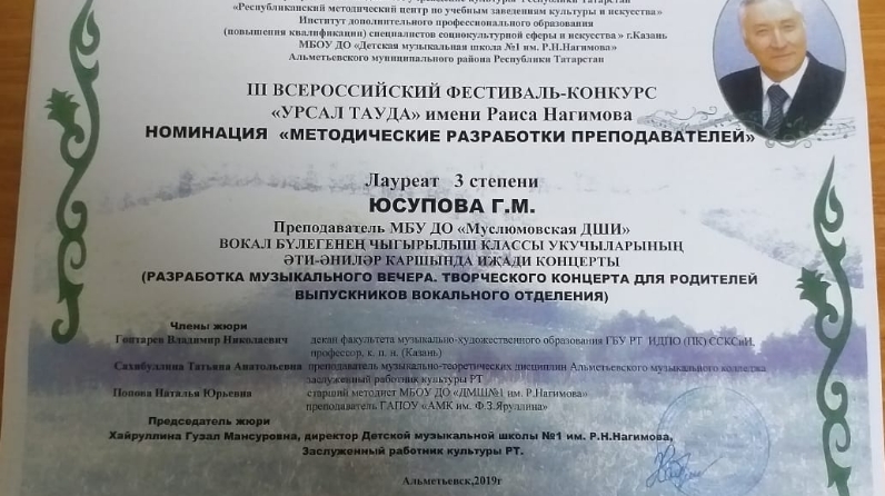 По традиция в мае месяце Альметьевский музыкальный колледж подводит итоги всероссийского конкурса «Урсал тауда» имени Раиса Нагимова и награждает победителей в номинации методические разработки. И в этом году преподаватели Муслюмовской детской школы искусств заняли призовые места в конкурсе. Диплому победителя удостоились Дильбар Салихзянова, Гульназ Юсупова, Гульназ Хафизова.