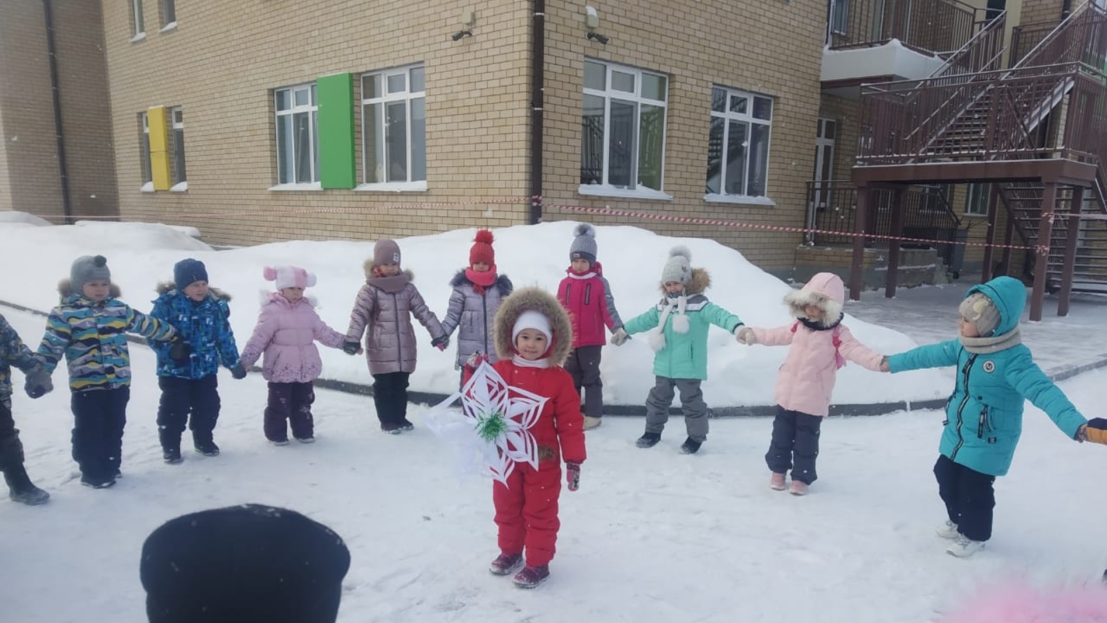 У нас сегодня День снега! Мы изучили красивые наряды снежинок, играли в снежки, пели веселые песни. С помощью клея и соли разукрасили плакат снежинками.