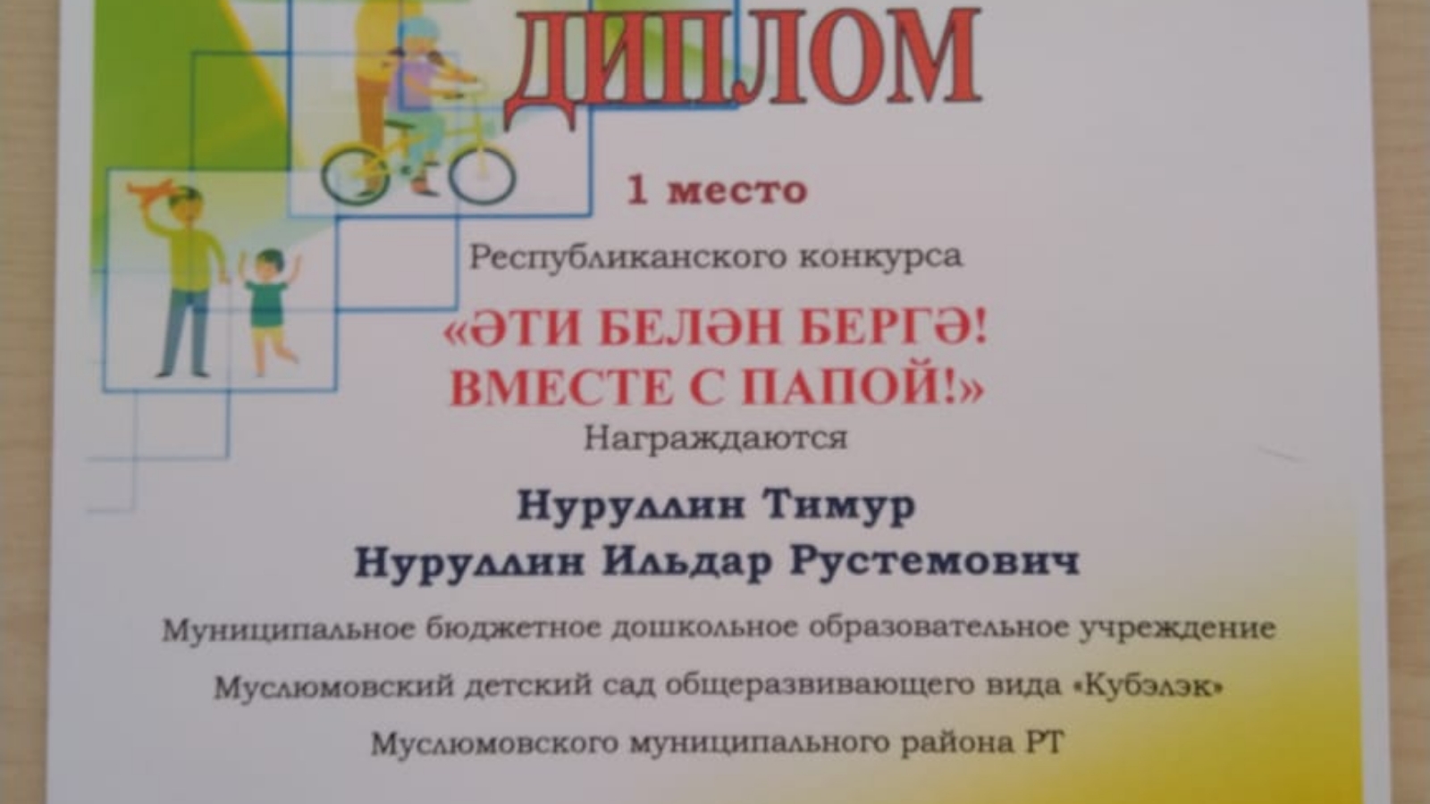 Поздравлям участников республиканского конкурса "Вместе с папой!": Гараеву Азалию, занявшую 3 место в номинации "Семейные традиции", Нуруллина Тимура, занявшего 1 место в номинации "Мастер на все руки!" и их воспитателя - Закирову Лилию Райхановну.