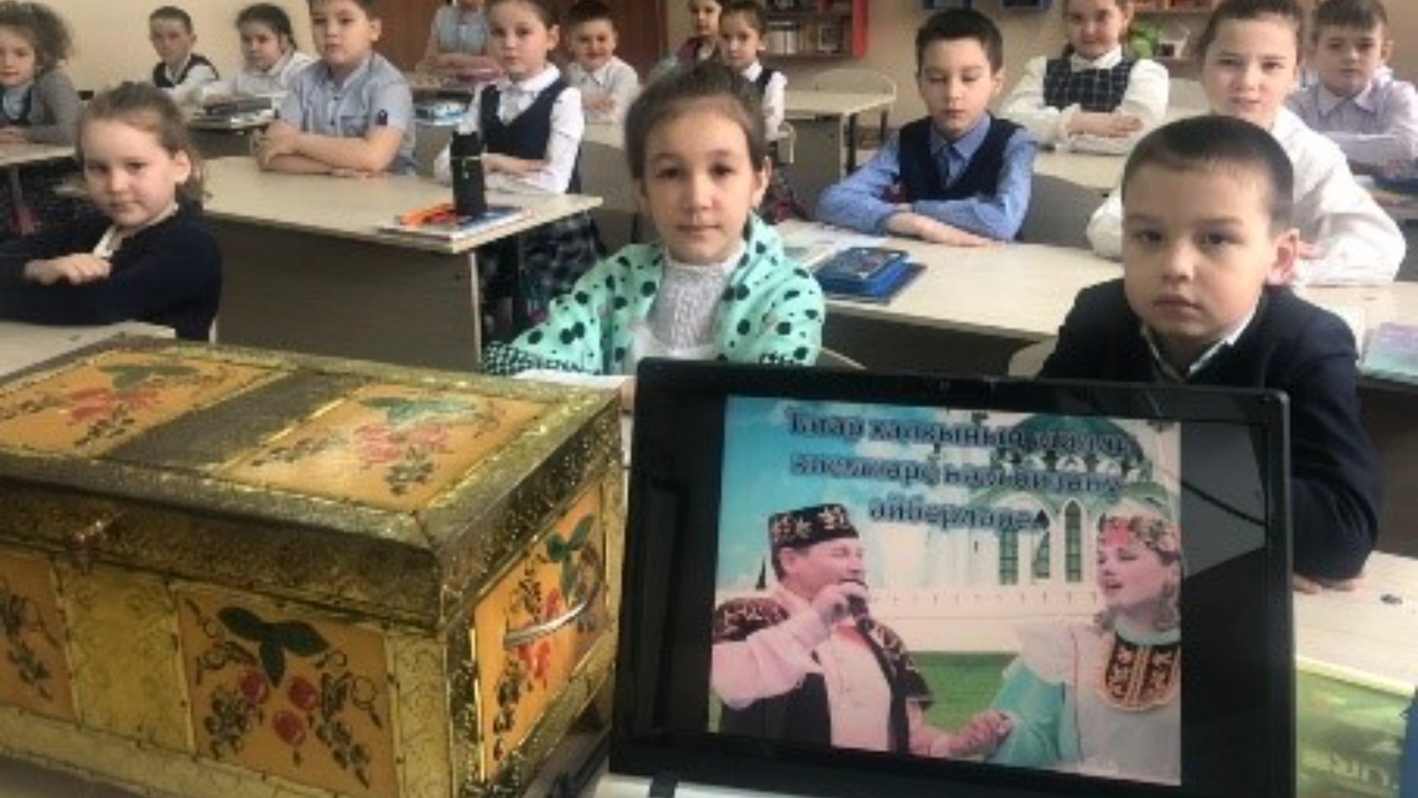 В рамках года родных языков и народного единства во 2б классе Муслюмовской гимназии с прошел классный час на тему «Национальные костюмы татарского народа». Учащиеся ознакомились с национальными костюмами и украшениями татарского народа, выполнили задания из загадочного сундука.