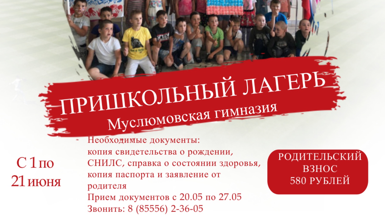 Стартует набор учащихся в пришкольный лагерь МБОУ "Муслюмовская гимназия". Необходимые документы:копия свидетельства о рождении, СНИЛС, справка о состоянии здоровья, копия паспорта и заявление от родителя