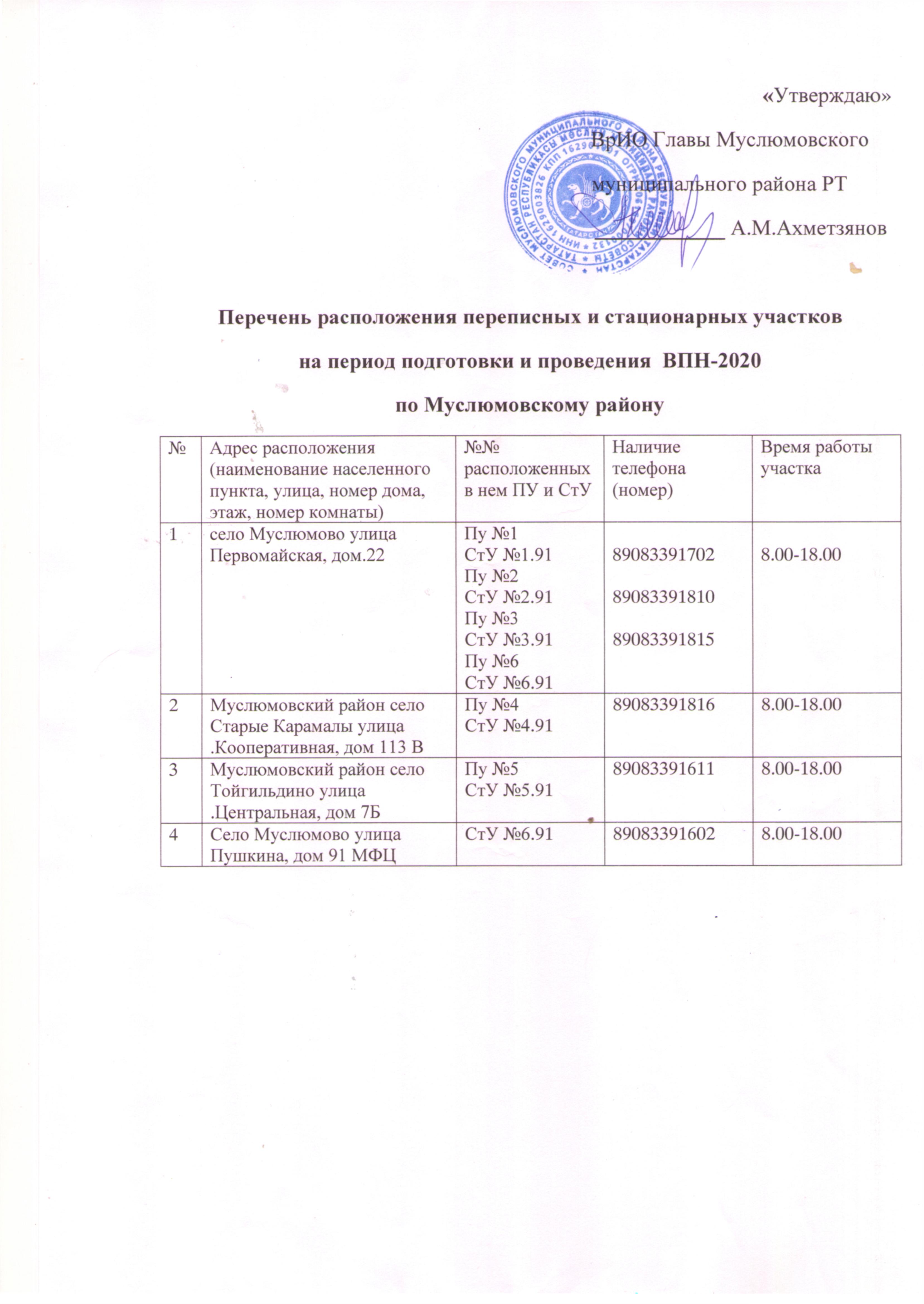 Перечень мест расположения помещений для размещения переписных и стационарных участков на период подготовки и проведения ВПН-2020
