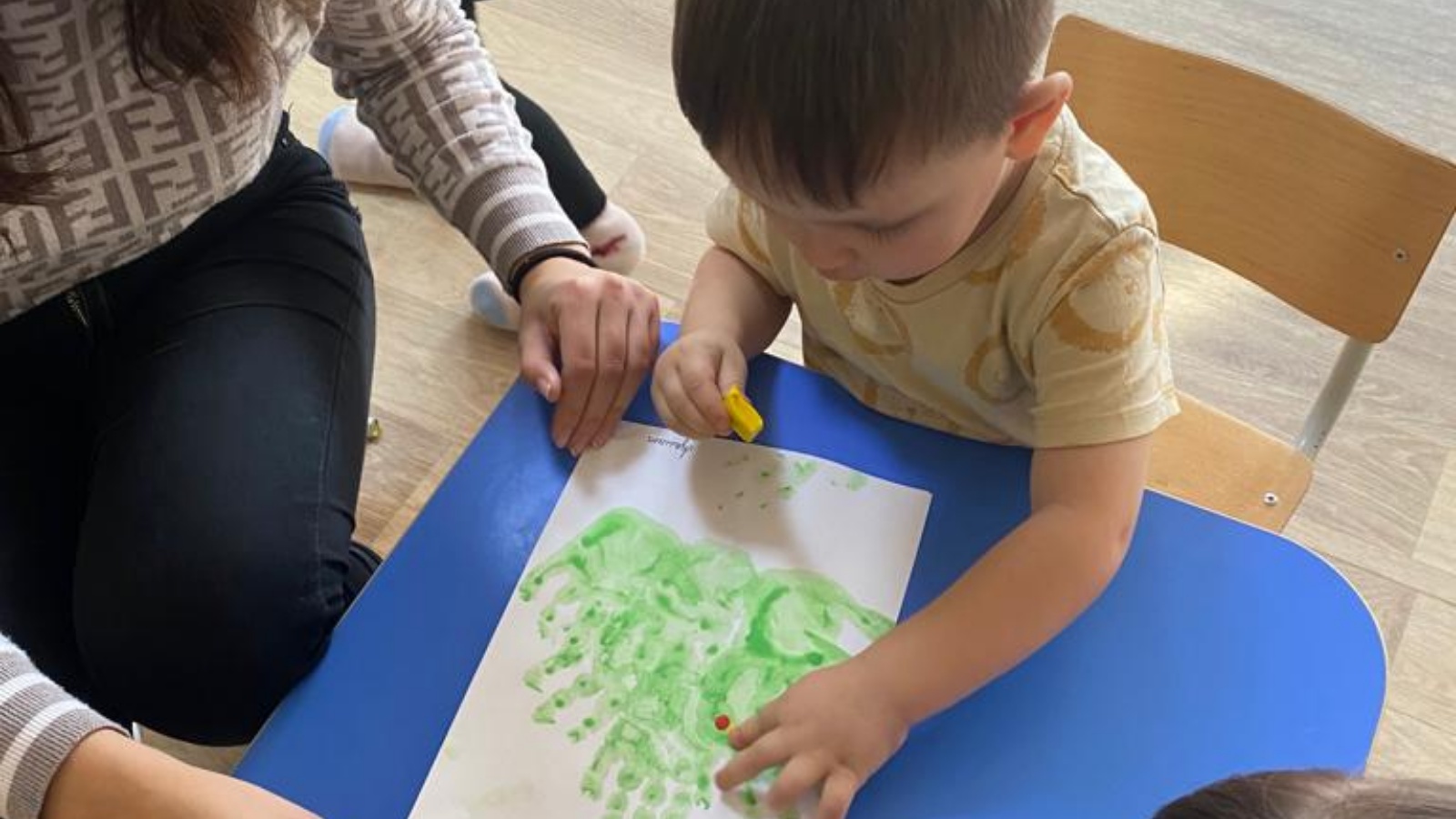 В первой младшей группе рисование. Дети своими руками сделали елку и украсили ее пластилином. Это повышает мышление детей, придает большое значение развитию моторики рук.
