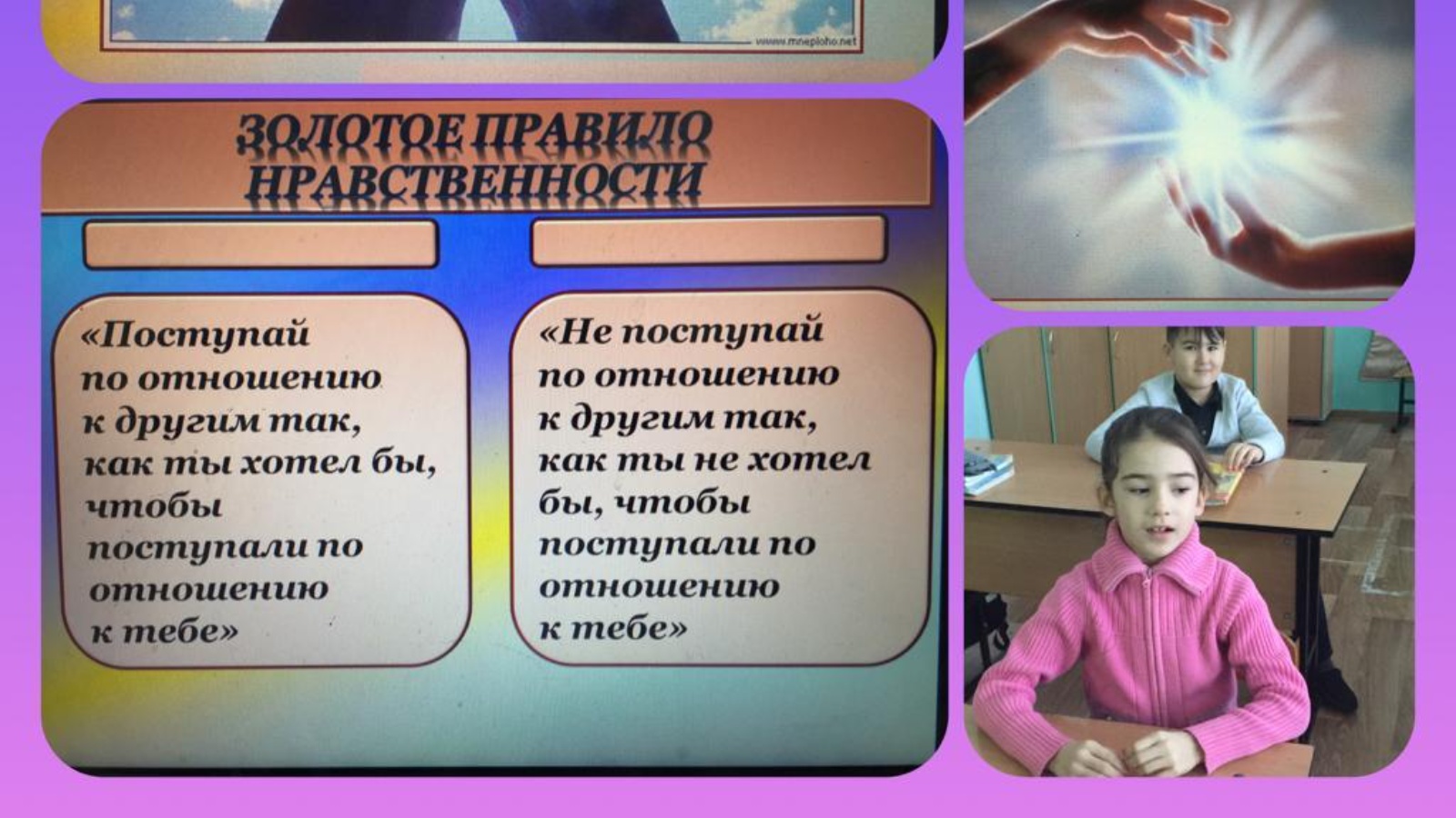 В начальных классах МБОУ Михайловская СОШ прошли уроки нравственности на тему "Золотое правило нравственности". На классном часу учащиеся говорили об уважительном, доброжелательном отношении к людям, учились понимать и сопереживать чувствам других людей.