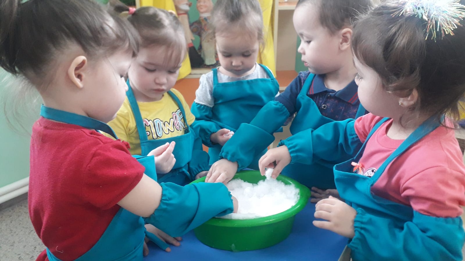 В рамках реализации проекта "В лаборатории удивительных открытий" ознакомление детей первой младшей группы со свойствами снега.