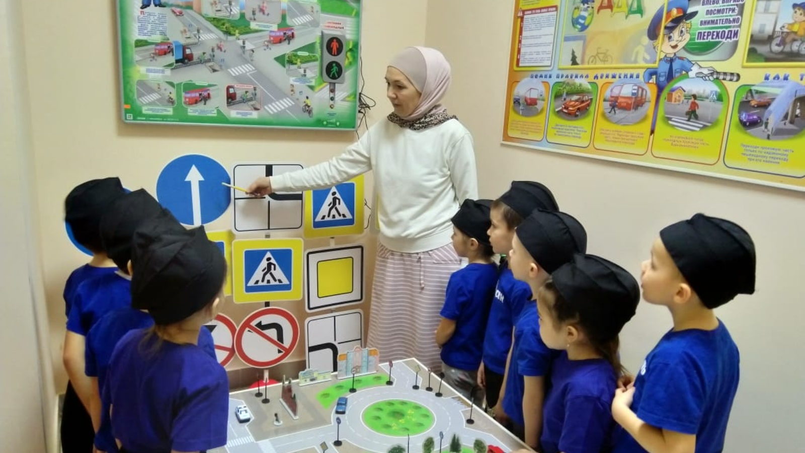 Дети старшей группы в кабинете ПДД. Повторили обозначения дорожных знаков, вспомнили несколько правил по безопасности дорожного движения. Игра с макетом дороги.