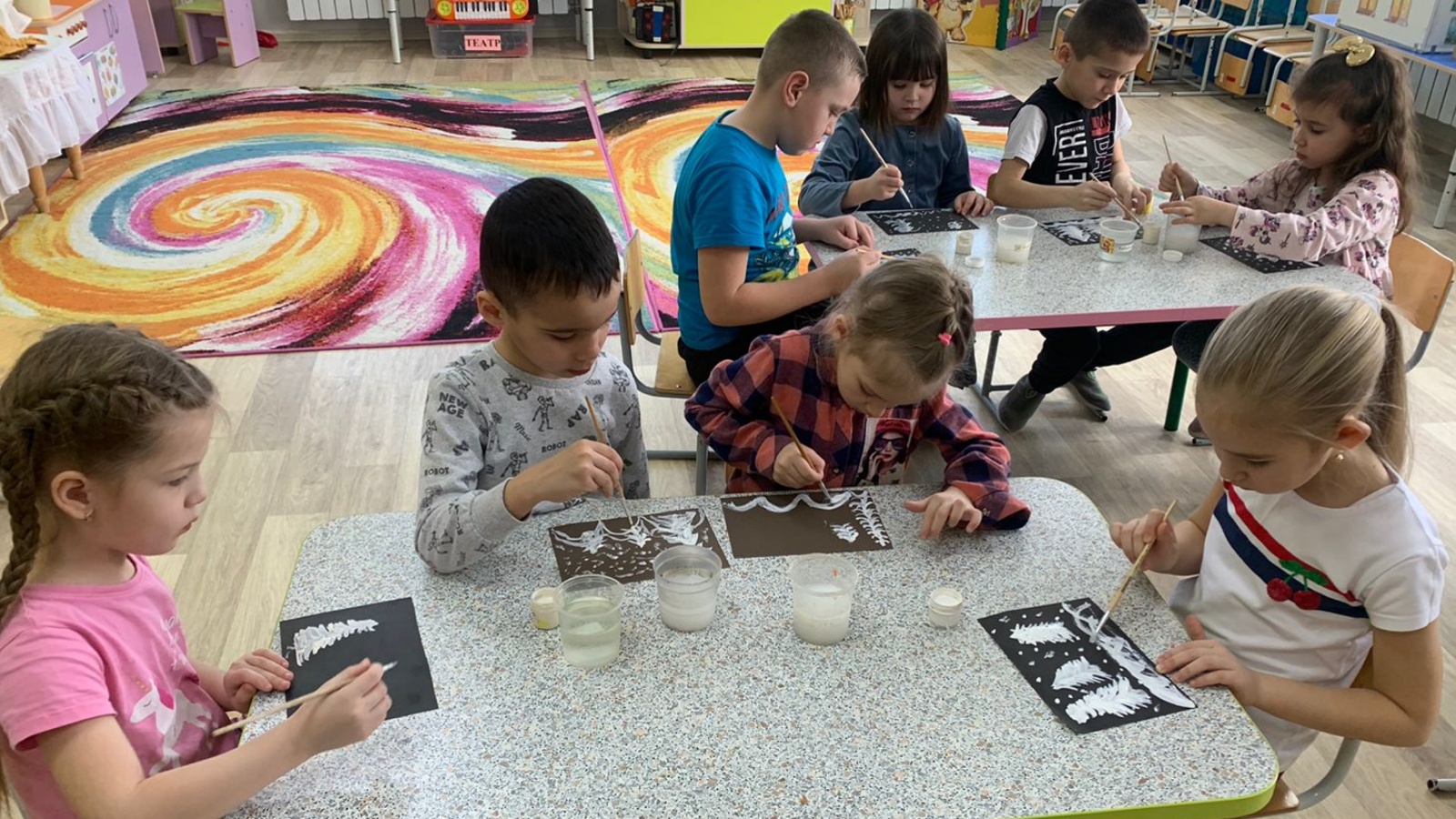 В подготовительной группе рисование: « Иней покрыл деревья».