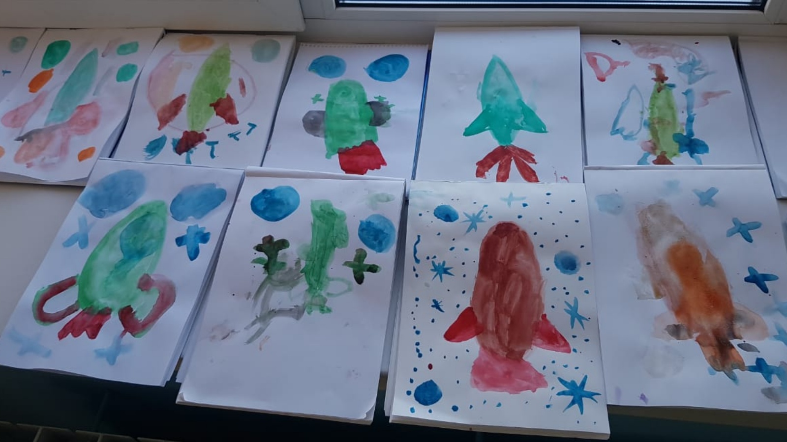 В средней группе рисование на тему: "Ракета". С детьми беседовали о космосе, нарисовали ракеты. Во время занятия у детей появился интерес к творчеству, желание придумывать и фантазировать.