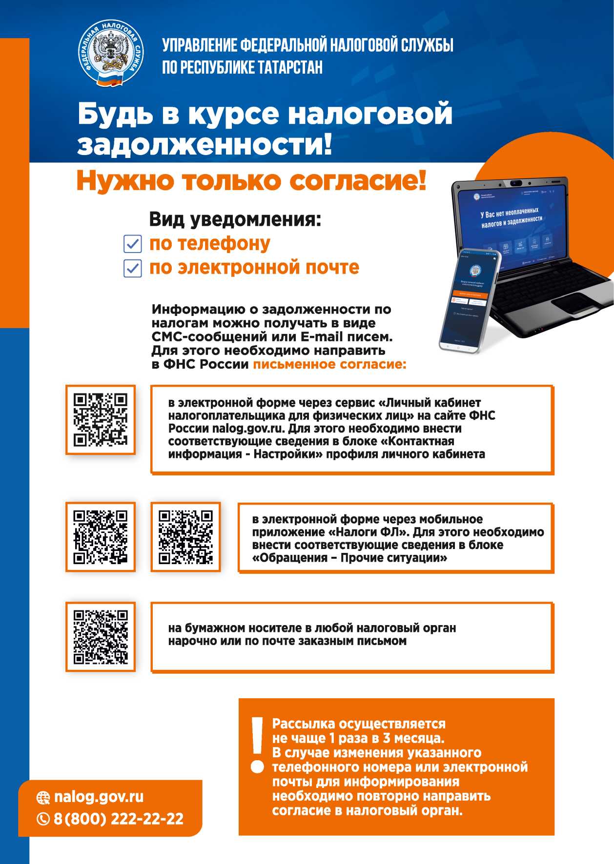 Межрайонная ИФНС России № 11 по РТ сообщает, что дав свое согласие на информирование, налогоплательщик сможет получать информацию о задолженности по налогам в виде СМС-сообщений на телефон или E-mail писем на электронную почту. Рассылка осуществляется не чаще 1 раза в 3 месяца.