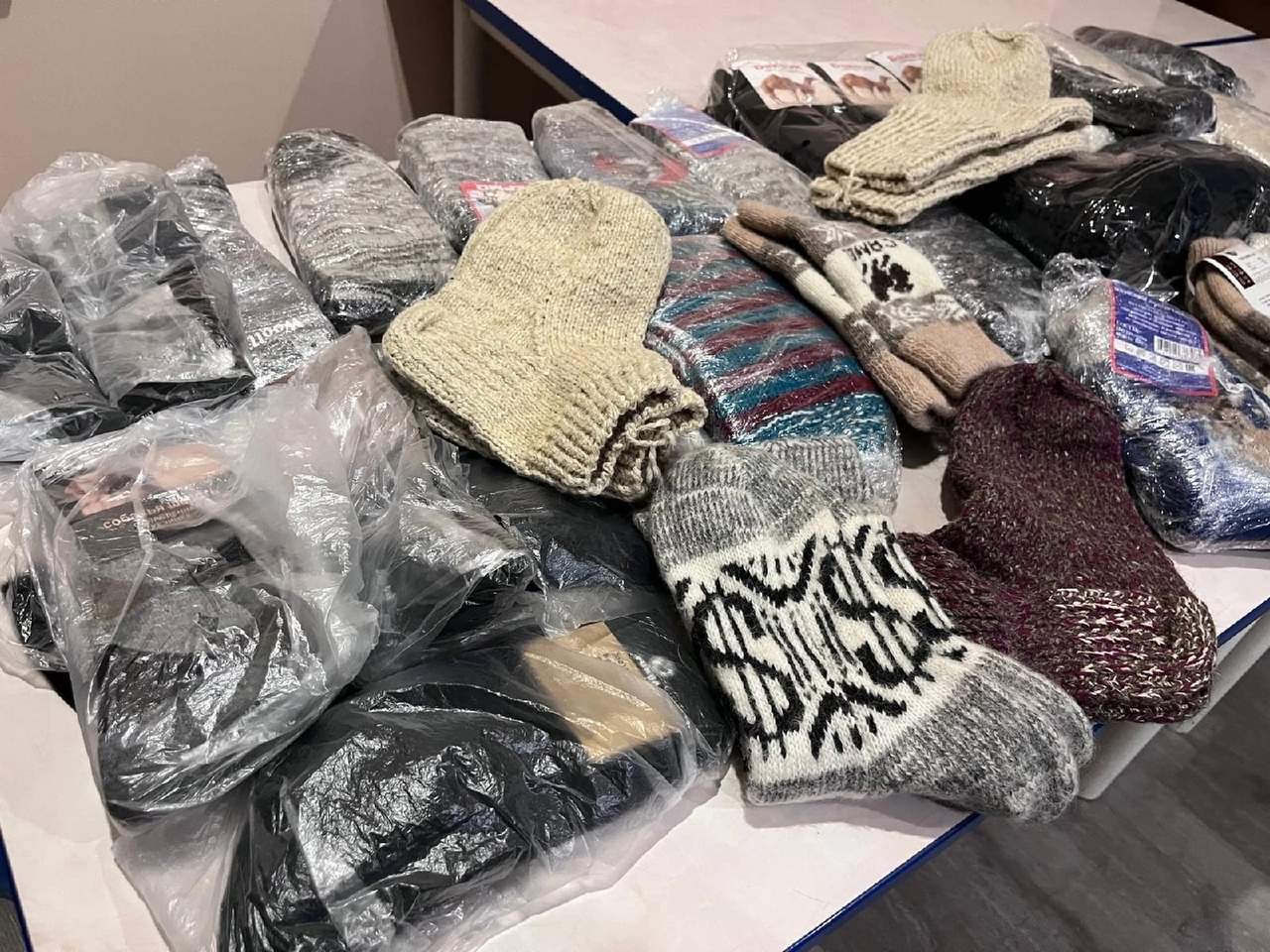 После очередной встречи в пункт приема гуманитарной помощи были переданы 82 пары теплых носков и 2 пары вязаных варежек, собранные местной организацией «Ак калфак».