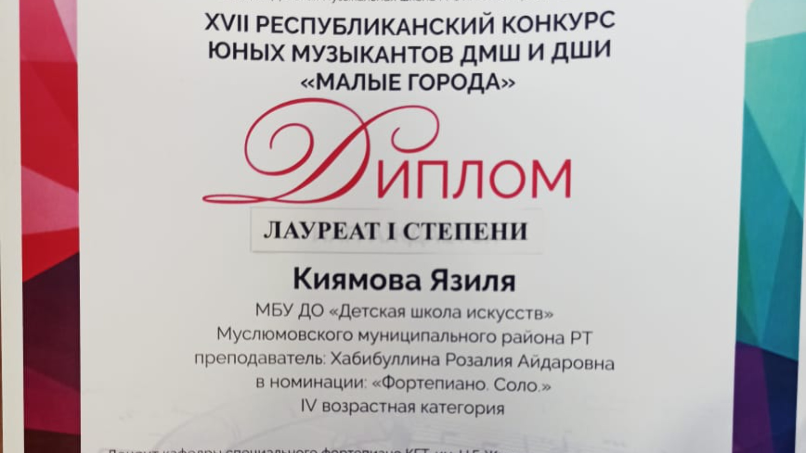 В номинации «Фортепииано. Соло» Язиля Киямова стала лауреатом I степени (преподаватель Розалия Хабибуллина), Ралина Шарипова и Индира Валеева дипломанты III степени (преподаватель Филюза Шарипова);