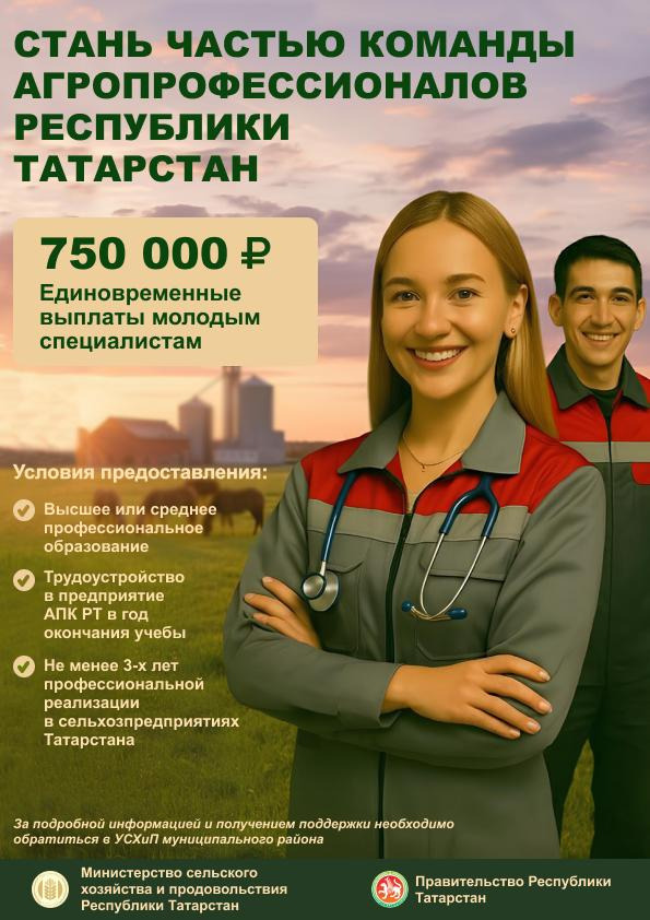 В Татарстане единовременная выплата по поддержке молодых специалистов в агропромышленном комплексе составляет 750 тыс.рублей.