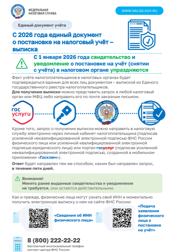 С 2026 года единым документом о постановке на учет в налоговом органе станет выписка
