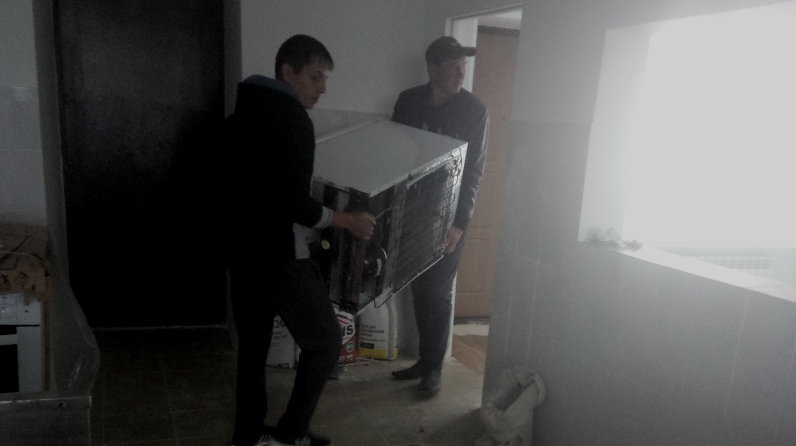 Күбәк урта мәктәбендә ашхәнәдә ремонт эшләре дәвам итә. Хезмәткәрләр, ремонт эшләрен башкаручылар ашхәнәдәге җиһазларны урнаштыралар.