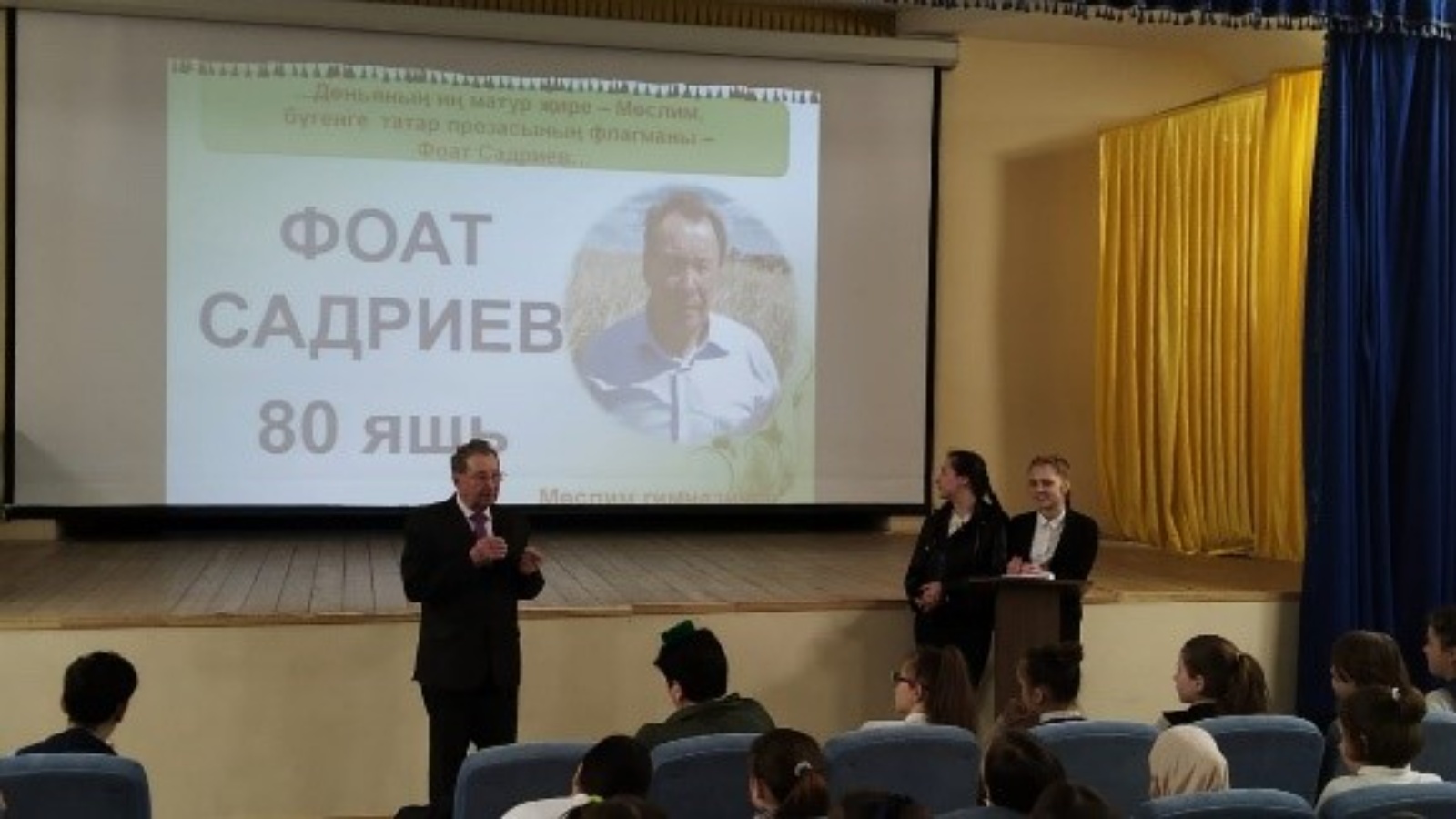 Туган телләр һәм халыклар бердәмлеге елы уңаеннан, Мөслим гимназиясендә якташ язучыбыз, Габдулла Тукай исемендәге Дәүләт бүләге иясе, Халык язучысы, Мөслим районының мактаулы гражданины, прозаик һәм драматург Фоат Миңлеәхмәт улы Садриев белән очрашу үткәрелде. Балалар 2019 нчы елда чыккан "Тургай" китабы буенча чыгыш ясадылар, табышмак-сорауларга җавап бирделәр. Фоат Садриевның тормышы, иҗаты буенча интеллектуаль уенда катнаштылар. Язучы үзенең фикерләре белән уртаклашты. Балаларга киңәшләрен, кызыксындырган сорауларына җавапларын бирде. Очрашу бик кызыклы үтте. "Тургай" әсәренең кайсыбер серләрен чишкәндә язучыбыз яшьлек елларына кайтты. Балаларны әдәбият дөньясында сәяхәттә йөртте. Яшь каләм тибрәтүчеләргә язучы һөнәренең серләрен өйрәтте. Нәрсә ул бәхет? Ничек максатыңа ирешергә? -дигән сорауларга укучылар язучы белән бергә җавап эзләделәр.