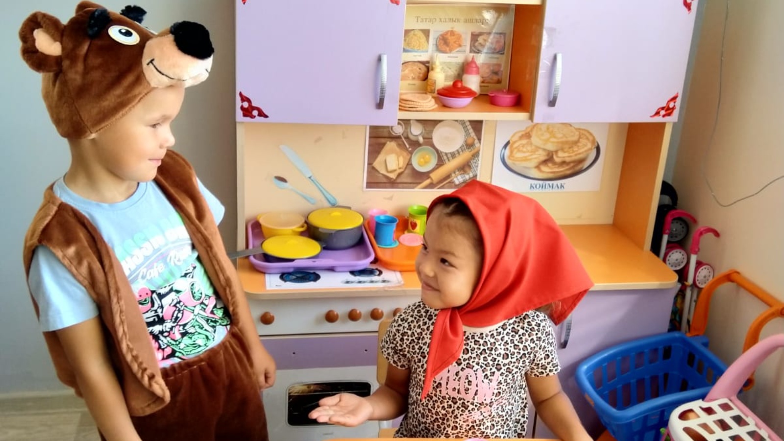 "Туган телләр һәм халыклар бердәмлеге" елы кысаларында зурлар төркемендә "Театр көне" унаеннан рус халык әкияте " Маша һәм аю" әкиятен сәхнәләштерү. Балалар белән рус телендә аудиоязма тыңлаганнан сон, әкиятне уйнап карадык.
