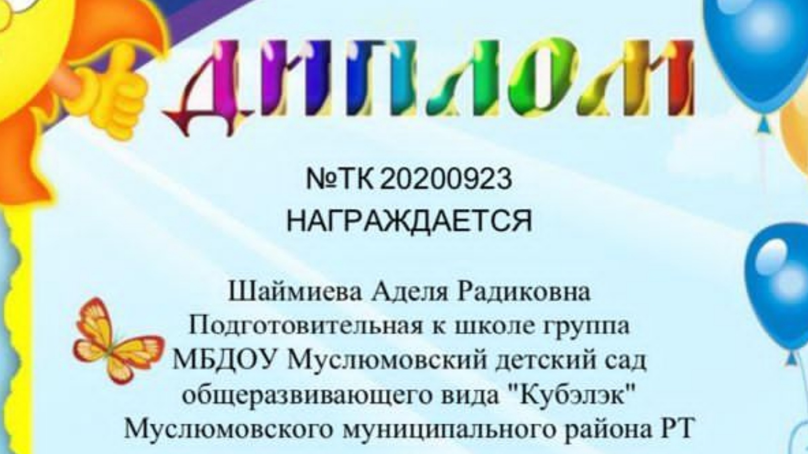 "Күбәләк" балалар бакчасының мәктәпкә әзерлек төркеме балалары Республикакүләм "Минем җәйге каникулларым" бәйгесенең "Фотолар" номинациясендә җиңү яуладылар. Җитәкчеләре Нәфисә Халиуллина.