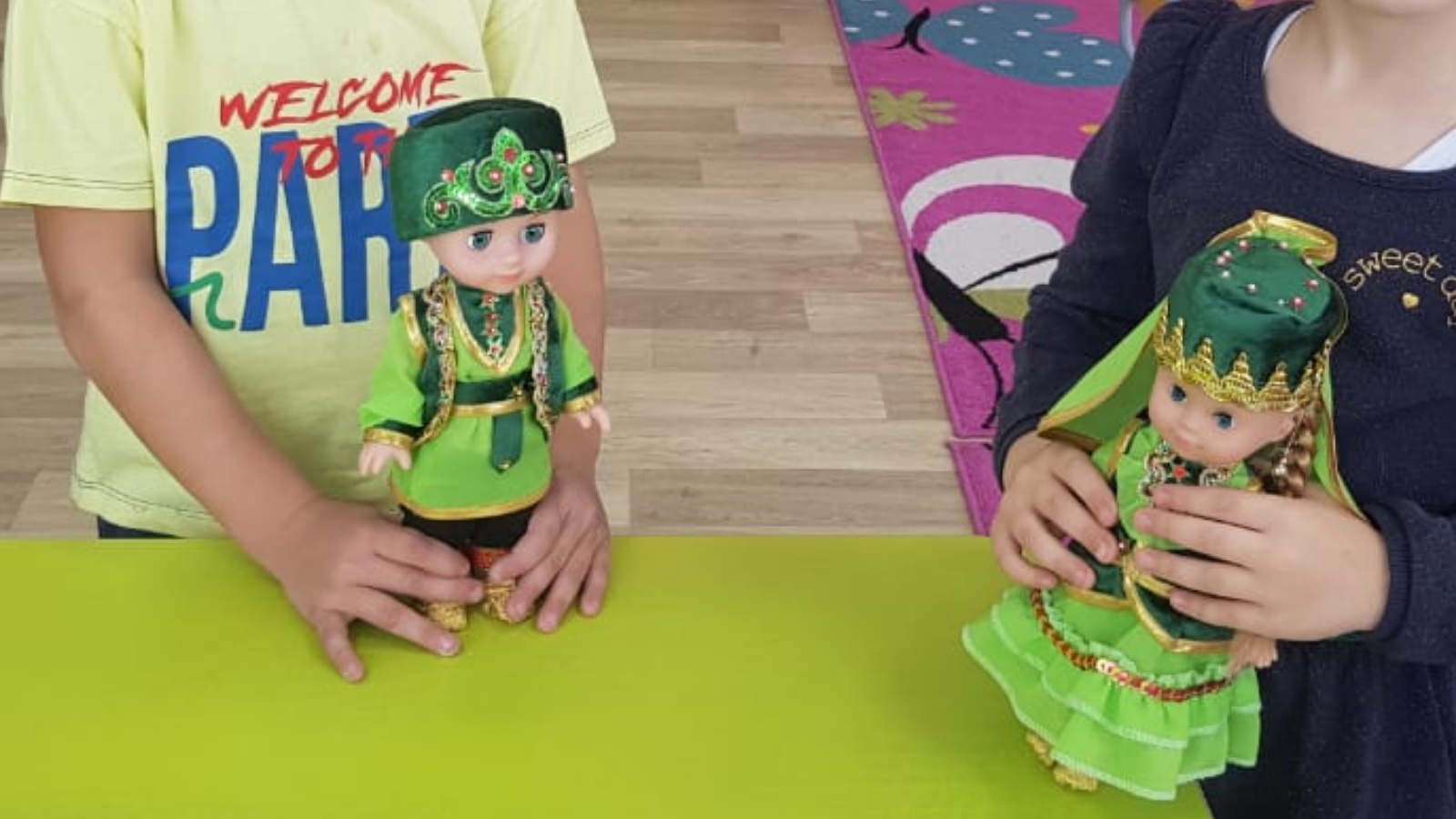 Туган телләр һәм халыклар бердәмлеге елы кысаларында Мөслим авылы "Күбәләк" балалар бакчасының зурлар төркеме балалары белән татар халкының милли киемнәре белән танышуны дәвам иттек.