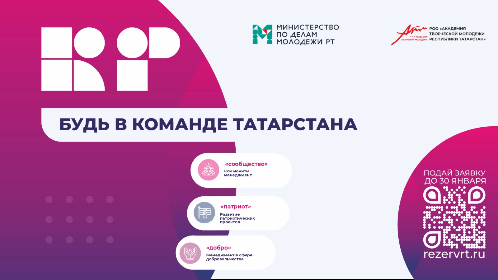 Ел саен проектта Татарстан Республикасы территориясендә яшәүче 16 яшьтән 35 яшькә кадәрге барлык социаль - демографик төркемнәр вәкилләре катнаша. Кандидатлар сайлап алу этапларын узалар: сайтта гариза тутыру www.rezervrt.ru - тест һәм экспертлар белән күзгә-күз сөйләшү. Сайлап алу мотивацияне, катнашуның максаты, лидерлык потенциалын, команда белән эшләү күнекмәләрен һәм катнашучыларның стандарт булмаган фикерләвен билгеләргә мөмкинлек бирә. "Кадрлар резервы. Татарстан Республикасы командасы-Татарстан Республикасында дәүләт яшьләр сәясәтен гамәлгә ашыру өчен кадрлар формалаштыру һәм үстерү бурычы торган проект. Әлеге проект яшьләр белән эшләү буенча белгечләрнең төп компетенцияләрен үстерергә ярдәм итәргә тиеш.