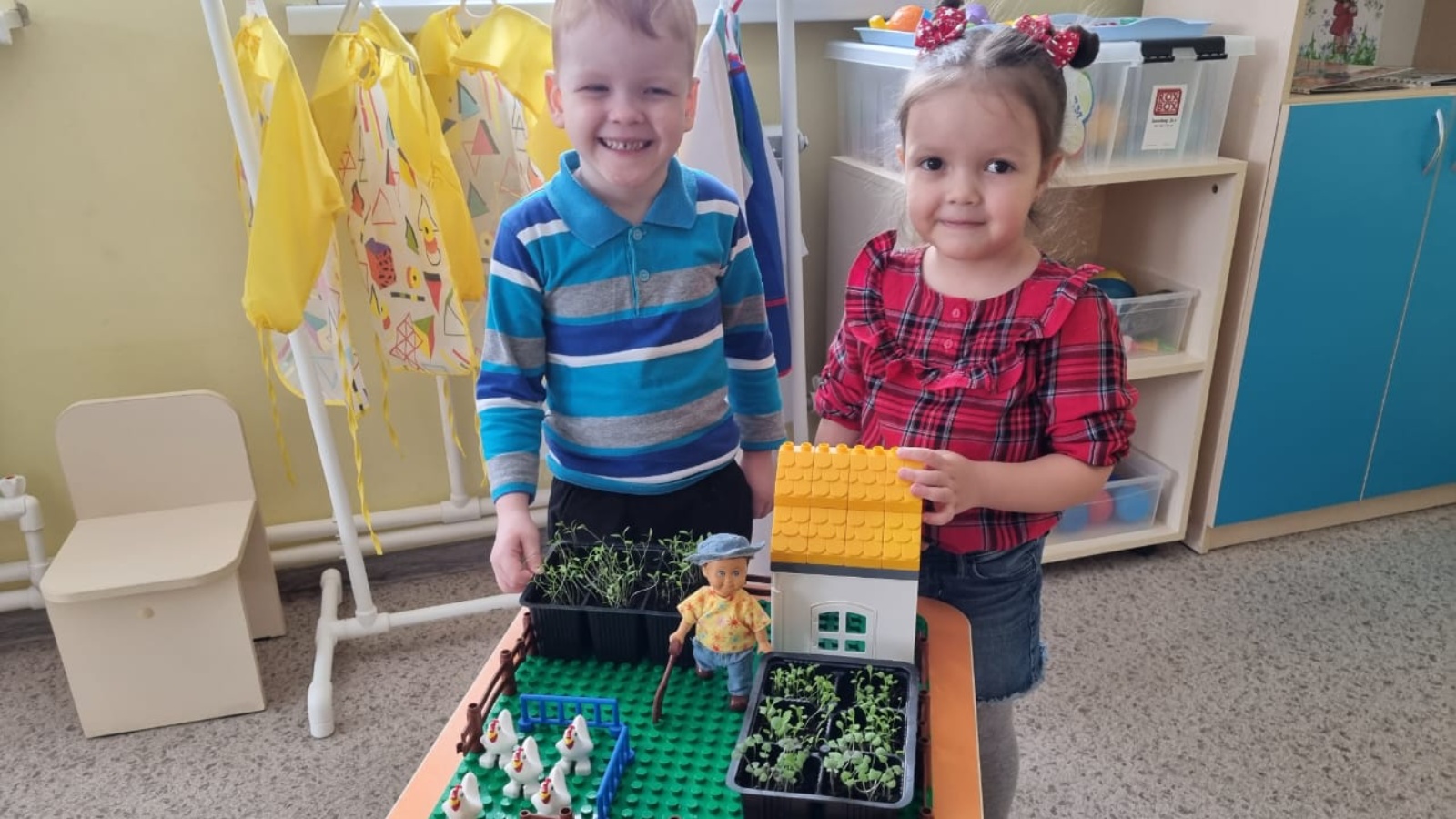 Икенче кечкенәләр төркеме балалары "Минем гаиләм" проекты кысаларында алып барылган "Лего төзү корылмалары" һәм "Су һәм аның үзлекләре" кече проектларын берләштереп, "Тәрәз төбем гөлбакча" темасы астында, үзләренең кечкенә яшеллек почмагын булдырды.