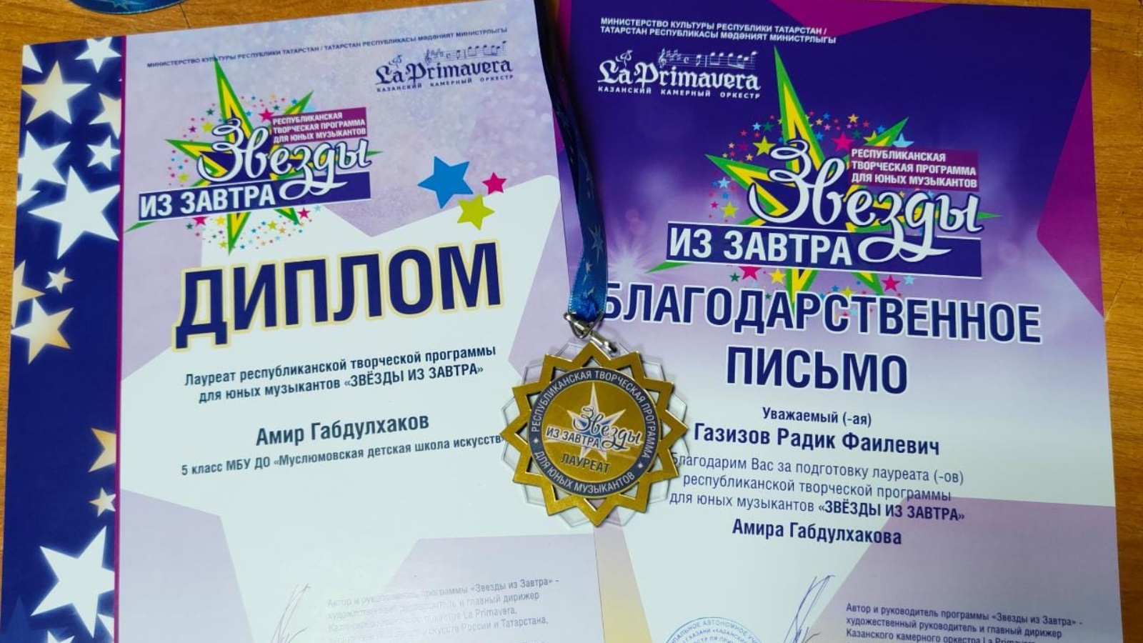 Мөслим сәнгать мәктәбенең якты йолдызлары шактый. Бүгенге көндә халык уен кораллары бүлегендә белем алучы Әмир Габдулхаков – шундыйларның берсе. Агымдагы уку елында Әмир тагын бер яңа баскычка күтәрелде. Ул Яр Чаллы шәһәрендә узган “Звезды из завтра” республика фестивалендә катнашып, финалга узды. Әлеге бәйгедә Россиянең танылган сәнгать иясе Рөстәм Абязев иң сәләтле дигән укучыларны сайлап алып, үзенең камера оркестры белән чыгыш ясау мөмкинлеге бирә. 15 апрель көнне Әмир дә “Ля Примавера” оркестры солисты буларак Яр Чаллы шәһәренең орган залында чыгыш ясап, лауреат исеменә лаек булды. Әмирнең укытучысы – Радик Газизов.