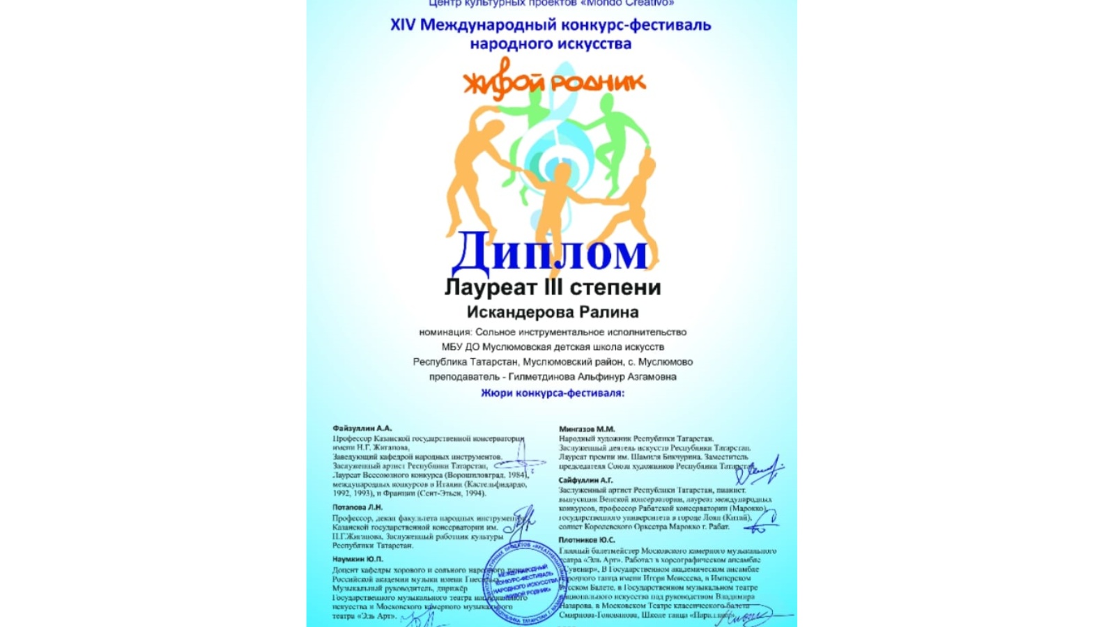 Күптән түгел Мөслим сәнгать мәктәбенең халык уен кораллары бүлеге укучысы җиңүгә иреште. Гитара сыйныфында белем алучы кызыбыз Ралина Искандерова халыкара халык иҗатының "Живой родник" дип исемләнгән конкурсында 3нче дәрәҗә лауреат исемен алды. Укытучысы Әлфинур Әзһәм кызы Гыйльметдинова Рәхмәт хатына ия булды. Котлыйбыз!