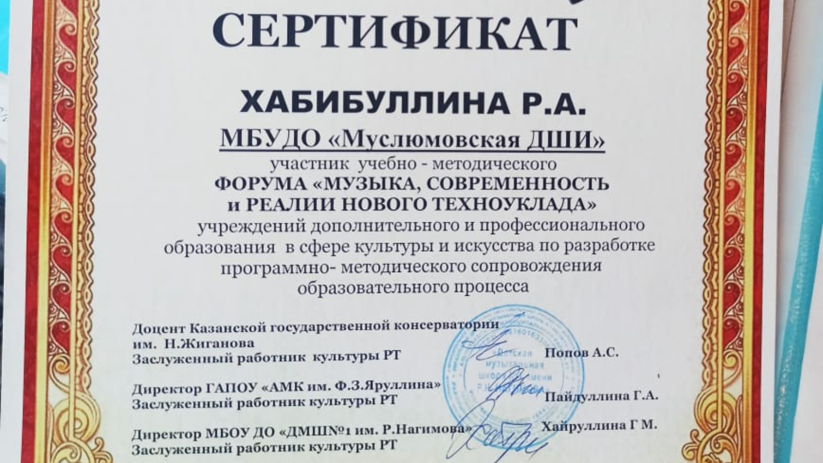 22 октябрь көнне Әлмәт музыка көллияте залында «Музыка, хәзерге заман һәм яңа техноуклад» фәнни-белем бирү форумы узды. Мөслим балалар сәнгать мәктәбе укытучылары Филүзә Шәрипова, Розалия Хәбибуллина, Рунар Шәяхмәтов, Алеся Латыйпова, Айгөл Шәйгарданова, Рәисә Харисова форумда катнаштылар. Форумның йомгаклау аккорды булып Казан дәүләт консерваториясе доценты Антон Сергеевич Попов студентларының концерты торды. Форумда катнашучыларның барысы да сертификатлар алды.