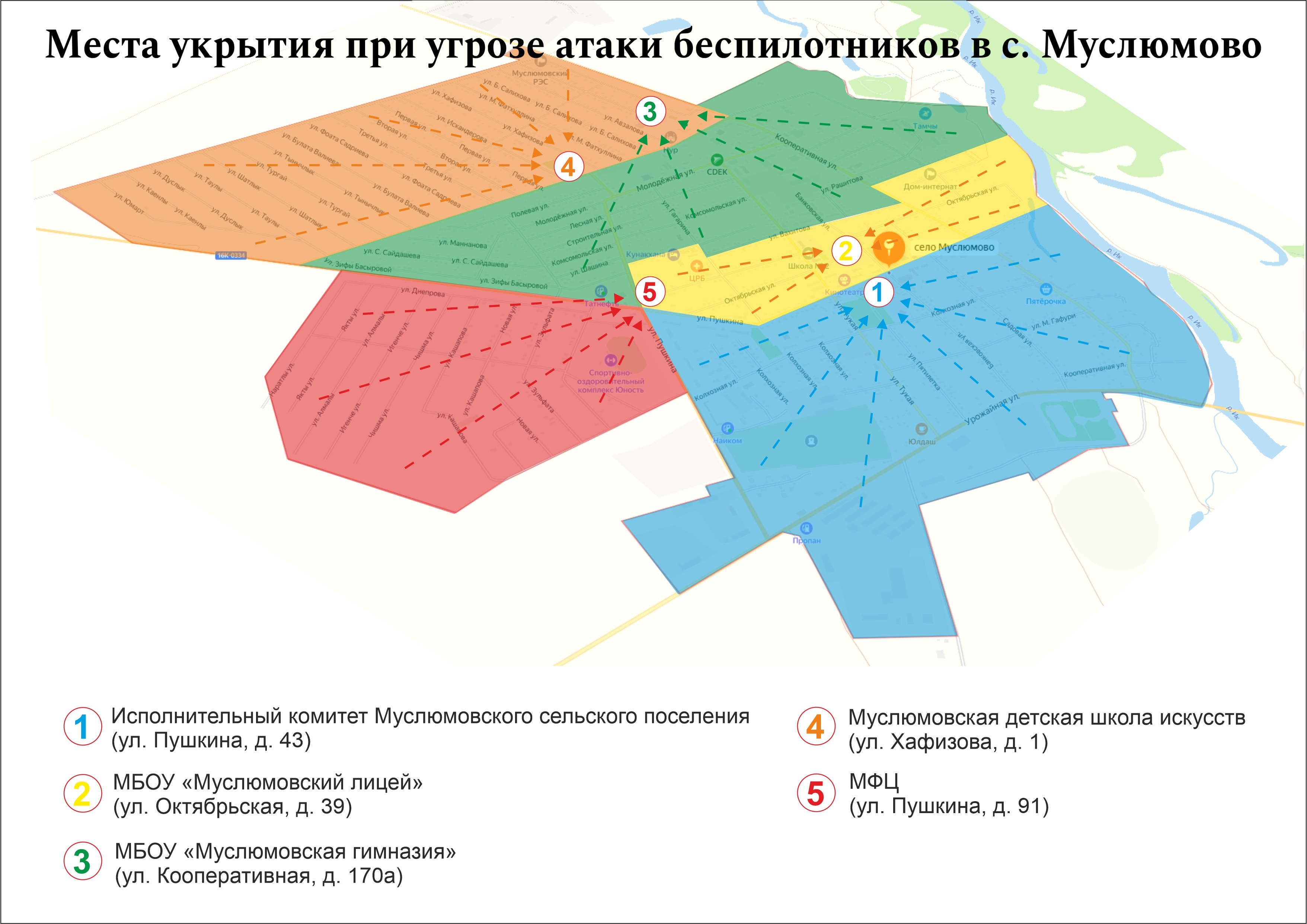 2. Пушкин урамыннан башлап, Вахитов урамына кадәрге "Иске Мөслим" территориясендә яшәүчеләр Октябрь урамы, 39 адресы буенча урнашкан Мөслим лицее подвалына качырга мөмкин.