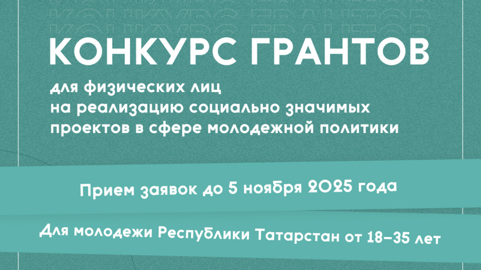 Татарстан Яшьләр министрлыгы физик затлар өчен грант конкурсын башлап җибәрде. гаризалар агымдагы елның 5 ноябренә кадәр Татарстан Республикасының «Минем субсидияләрем» мәгълүмат системасында кабул ителә: https://subsidiya.tatarstan.ru/landing/grants/189 катнашучылар булып Татарстан Республикасы территориясендә яшәүче, товарлар, эшләр, хезмәт күрсәтүләр җитештерүче һәм һөнәри керемгә салым түләүче булмаган, Татарстан Республикасы территориясендә яшьләр сәясәте өлкәсендә социаль әһәмиятле проектны гамәлгә ашыруны планлаштыручы 18 яшьтән 35 яшькә кадәрге Россия Федерациясе гражданнары була ала. Яшьләр өчен мөмкинлекләр тудыру «яшьләр һәм балалар»милли проекты максатларына туры килә.